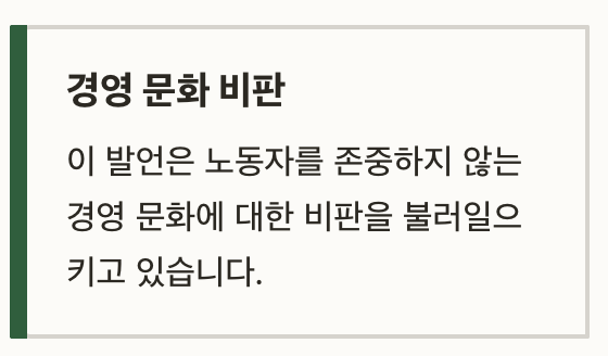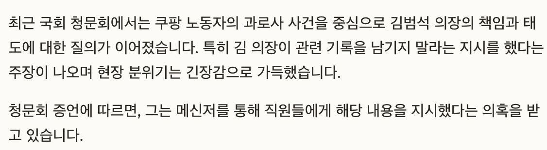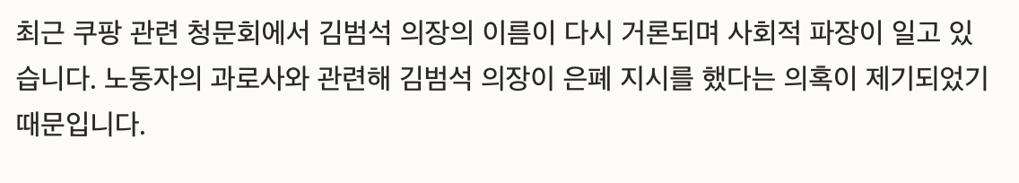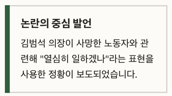 논란의 중심에는 김범석 의장이 했다고 알려진 발언이 있습니다. 사망한 노동자와 관련해 “열심히 일하겠나”라는 표현을 사용한 정황이 보도되며, 노동자를 존중하지 않는 경영 문화에 대한 비판이 거세지고 있습니다. 이 발언은 쿠팡 내부에서 노동자에 대한 인식이 어떤지를 상징적으로 보여준다는 목소리도 큽니다.