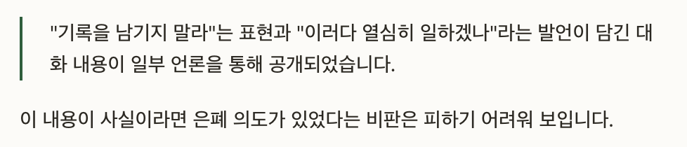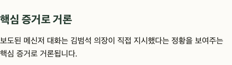 보도된 메신저 대화는 김범석 의장이 직접 지시했다는 정황을 보여주는 핵심 증거로 거론됩니다. "기록을 남기지 말라"는 표현과 “이러다 열심히 일하겠나”라는 발언이 담긴 대화 내용은 일부 언론을 통해 공개되었고, 이 내용이 사실이라면 은폐 의도가 있었다는 비판은 피하기 어려워 보입니다.