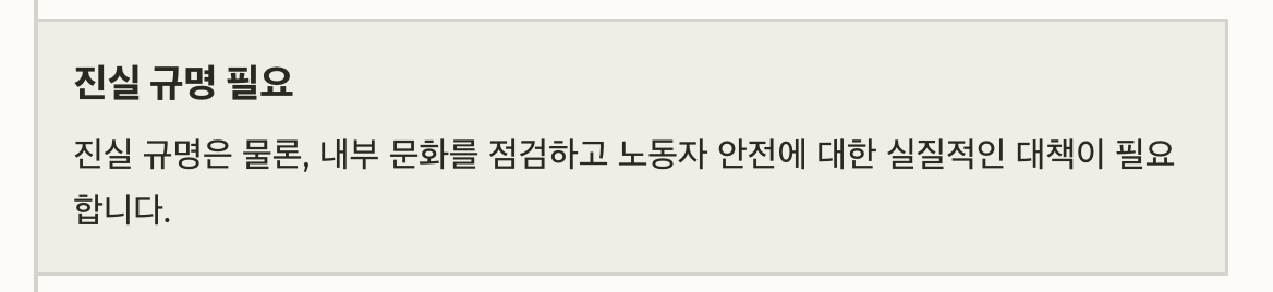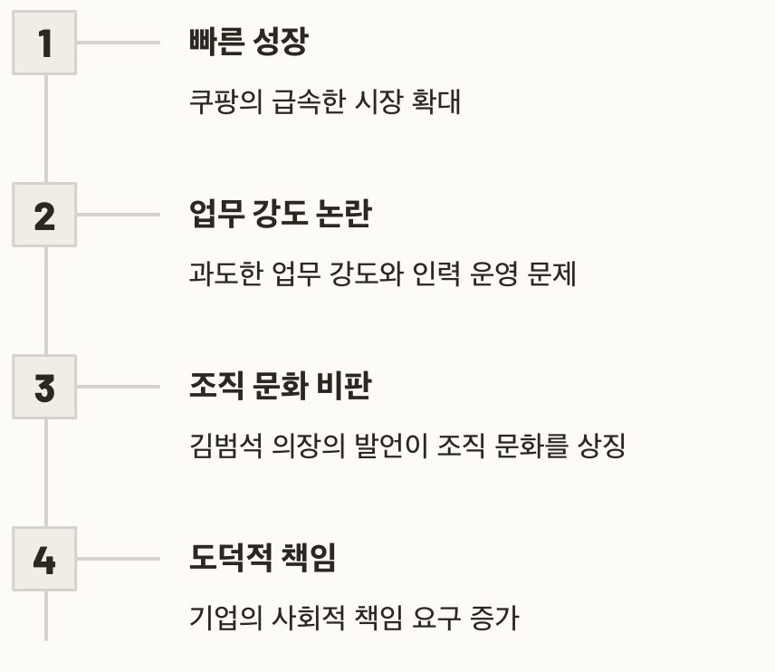이번 사건은 단순한 의혹을 넘어, 쿠팡의 경영 전반에 대한 신뢰 문제로 이어지고 있습니다. 쿠팡은 그간 빠른 성장의 이면에 과도한 업무 강도와 인력 운영 논란이 이어져 왔습니다. 김범석 의장의 발언과 태도가 이러한 조직 문화를 상징하는 사례로 해석되면서, 쿠팡의 도덕적 책임을 묻는 목소리도 높아지고 있습니다.