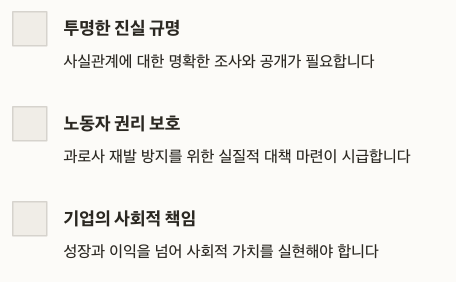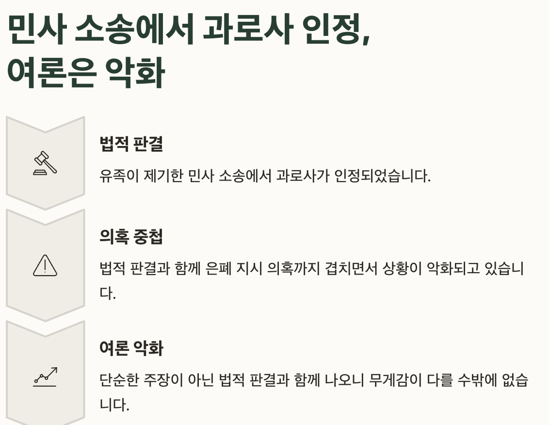 이번 사건이 더욱 주목받는 이유는 유족이 제기한 민사 소송에서 과로사가 인정되었기 때문입니다. 법적으로 과로사 판결이 내려진 상황에서 은폐 지시 의혹까지 겹치면서 여론은 급속히 악화되고 있습니다. 단순한 주장이 아닌, 법적 판결과 함께 나오니 무게감이 다를 수밖에 없습니다.