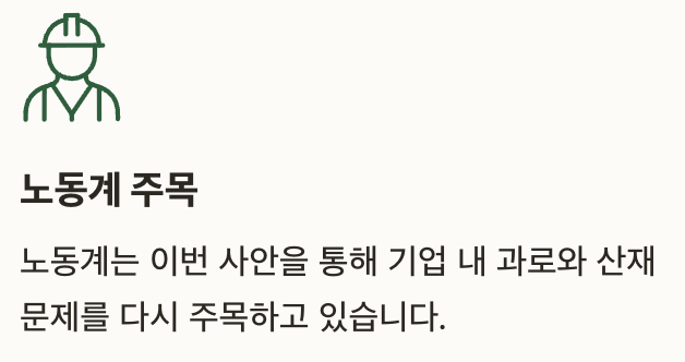 이 사건은 단순히 기업 내부 문제에 그치지 않고, 정치권과 시민단체에서도 반응을 불러일으키고 있습니다. 일부 국회의원들은 추가 조사와 재발 방지책을 요구하며 목소리를 높이고 있고, 노동계 역시 이번 사안을 통해 기업 내 과로와 산재 문제를 다시 주목하고 있습니다.