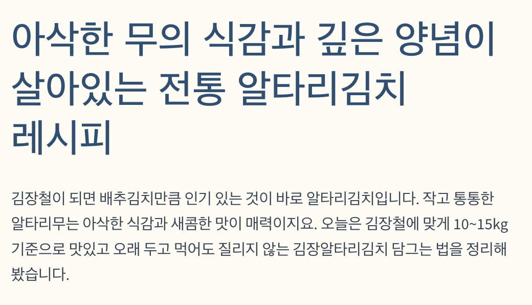 김장철이 되면 배추김치만큼 인기 있는 것이 바로 알타리김치입니다. 작고 통통한 알타리무는 아삭한 식감과 새콤한 맛이 매력이지요. 오늘은 김장철에 맞게 10~15kg 기준으로 맛있고 오래 두고 먹어도 질리지 않는 김장알타리김치 담그는 법을 정리해봤습니다.