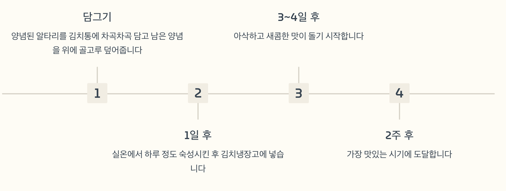 양념된 알타리를 김치통에 차곡차곡 담은 뒤, 남은 양념을 위에 골고루 덮어줍니다. 실온에서 하루 정도 숙성시킨 후 김치냉장고에 넣으면 됩니다. 3~4일이 지나면 아삭하고 새콤한 맛이 돌기 시작하며, 2주 정도 지나면 가장 맛있습니다.