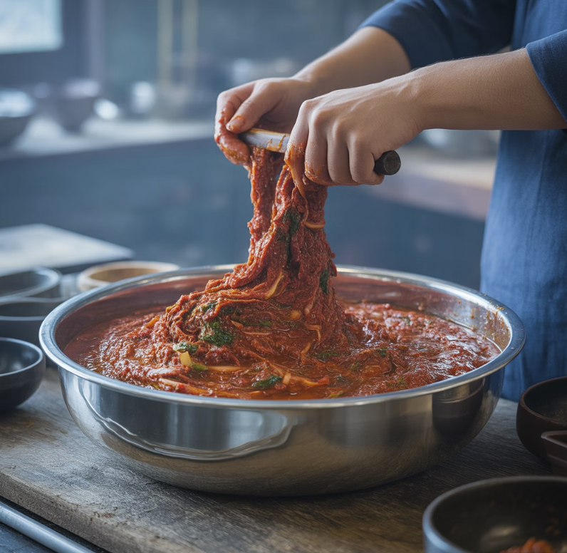 찹쌀풀에 고춧가루를 섞어 색을 낸 뒤, 마늘·생강·새우젓·액젓을 순서대로 넣습니다. 마지막에 설탕과 쪽파를 넣고 살짝 버무리면 완성입니다. 너무 오래 치대면 풋내가 날 수 있으니 살살 섞어주세요.