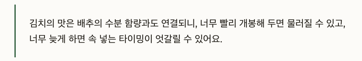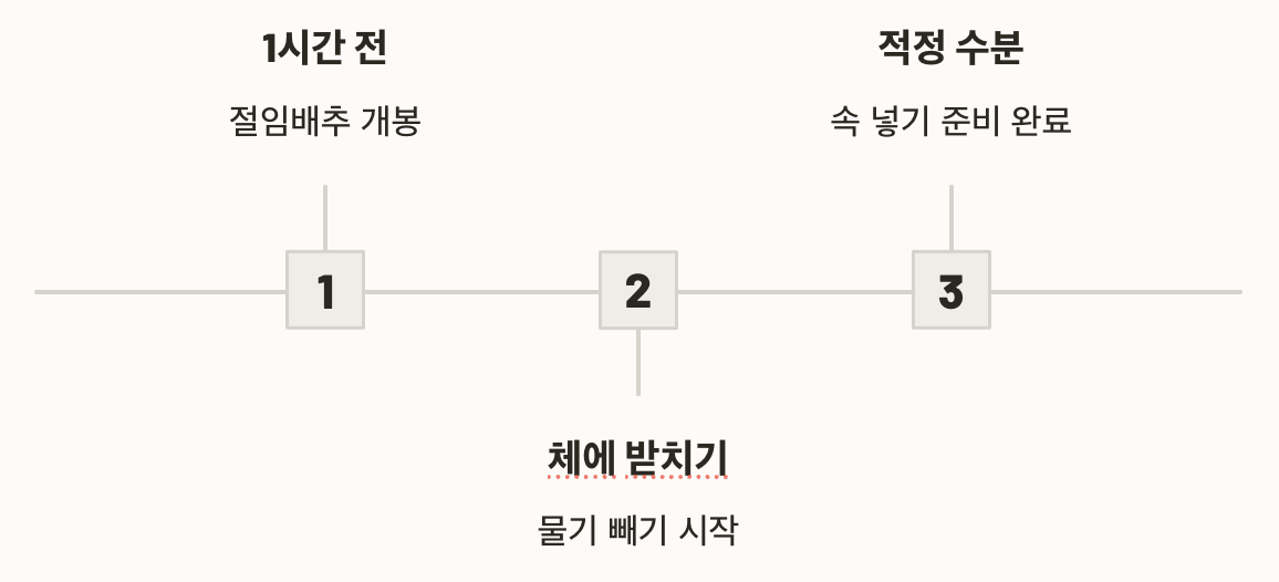 김치의 맛은 배추의 수분 함량과도 연결되니, 너무 빨리 개봉해 두면 물러질 수 있고, 너무 늦게 하면 속 넣는 타이밍이 엇갈릴 수 있어요.