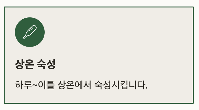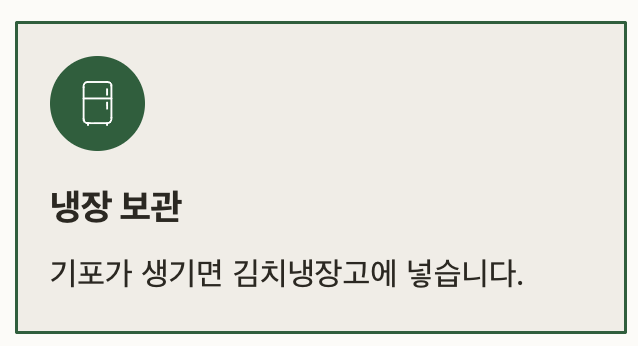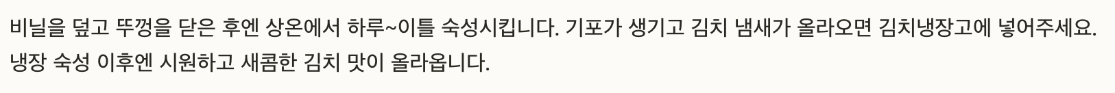비닐을 덮고 뚜껑을 닫은 후엔 상온에서 하루~이틀 숙성시킵니다. 기포가 생기고 김치 냄새가 올라오면 김치냉장고에 넣어주세요.