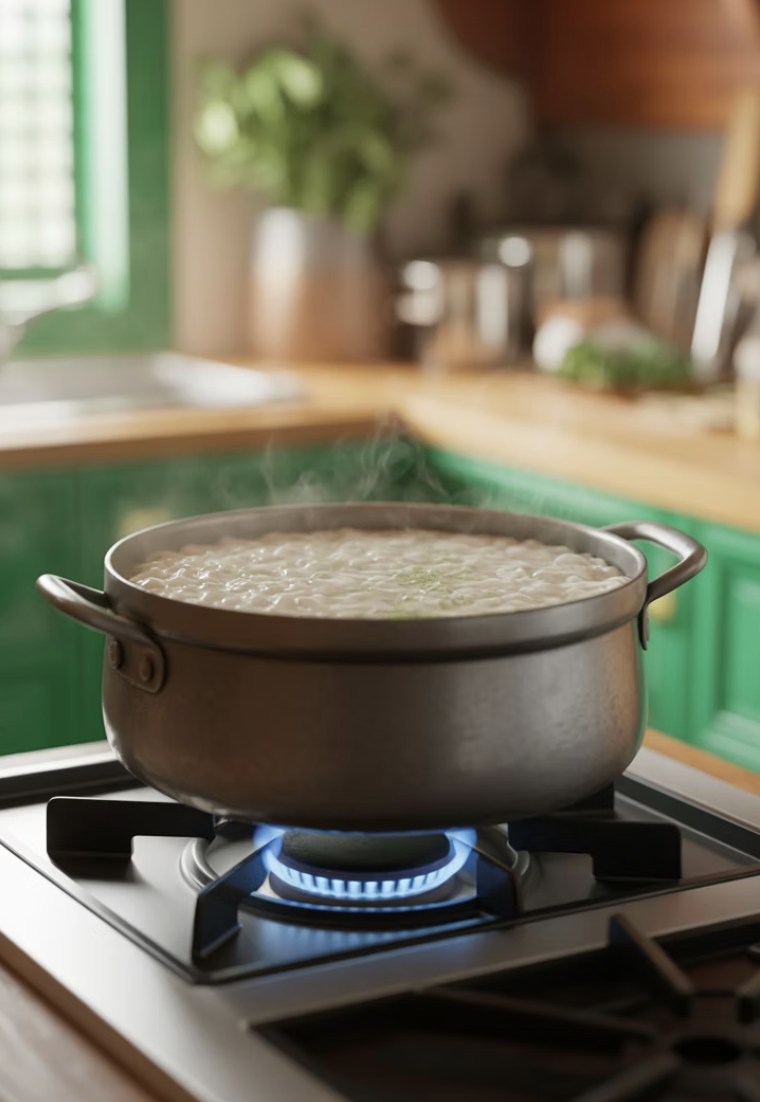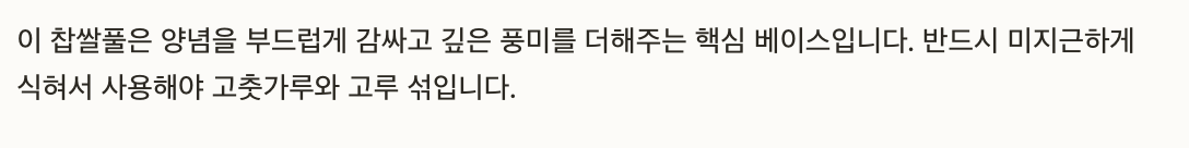 찹쌀 1.5컵에 물 2리터, 가루 육수 3개를 넣고 센불에서 바글바글 끓이다 중불로 15분, 약불로 3분 마무리합니다. 이 찹쌀풀은 양념을 부드럽게 감싸고 깊은 풍미를 더해주는 핵심 베이스입니다. 반드시 미지근하게 식혀서 사용해야 고춧가루와 고루 섞입니다.