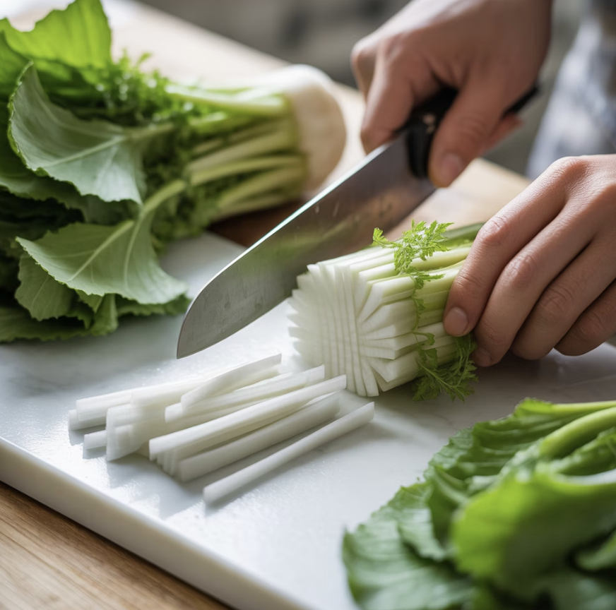 갓 1단(1kg)은 1~2cm 폭으로 썰고, 쪽파 500g은 3cm 길이로 썰어 물기를 꼭 짜줍니다. 무는 1.5개는 채 썰고, 1.5개는 섞박지 모양으로 썰어 속과 김치 사이사이에 넣습니다.
