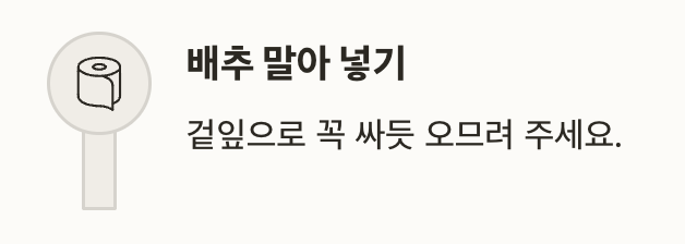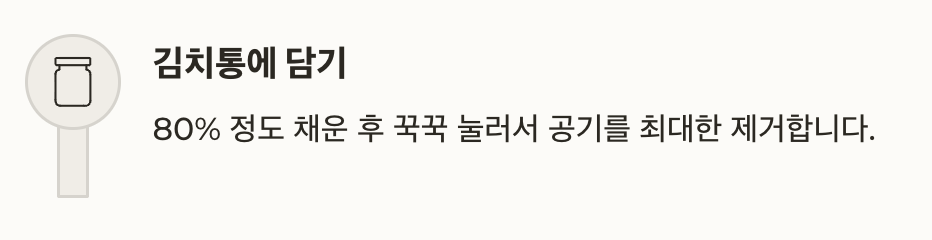 배추를 말아 넣을 때 겉잎으로 꼭 싸듯 오므려 주고, 김치통에는 80% 정도 채운 후 꾹꾹 눌러서 공기를 최대한 제거합니다.