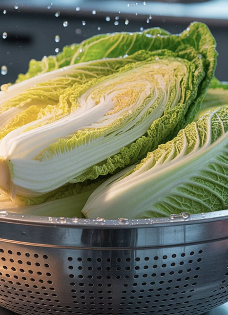 절임배추는 사용 1시간 전쯤 개봉해 체에 받쳐 물기를 빼주는 게 포인트입니다.