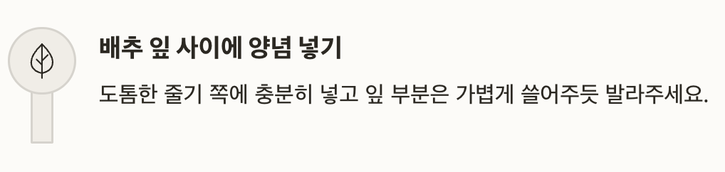 배추 잎 사이에 양념을 넣되, 도톰한 줄기 쪽에 충분히 넣고 잎 부분은 가볍게 쓸어주듯 발라주세요.