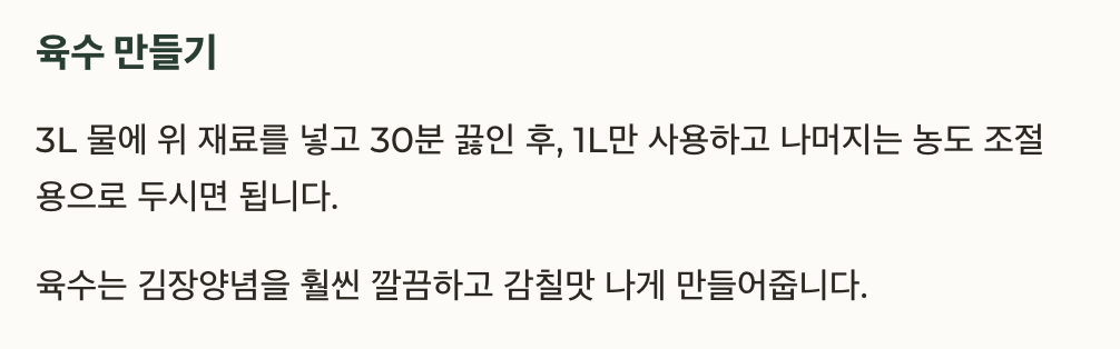 3L 물에 위 재료를 넣고 30분 끓인 후, 1L만 사용하고 나머지는 농도 조절용으로 두시면 됩니다. 육수는 김장양념을 훨씬 깔끔하고 감칠맛 나게 만들어줍니다.
