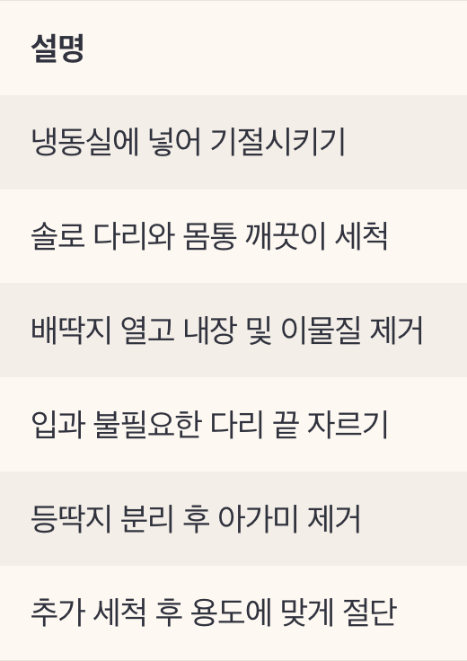 | 5단계 | 등딱지 분리 후 아가미 제거 |