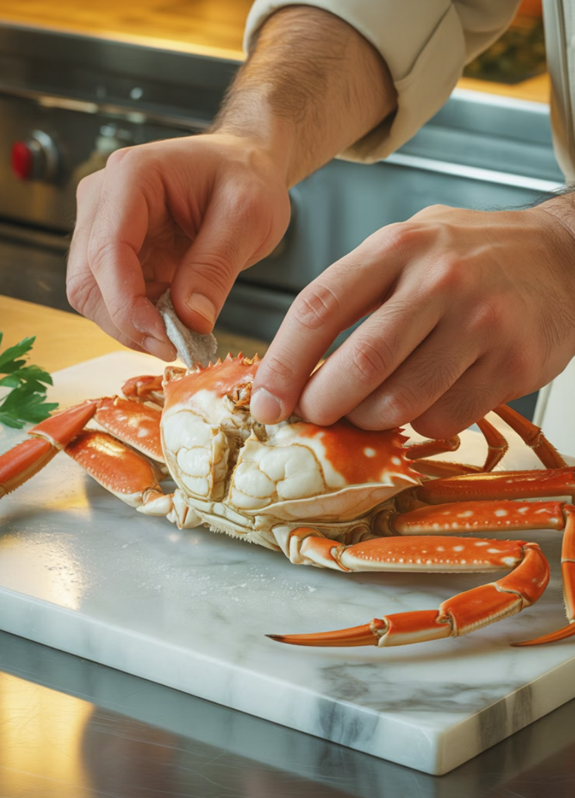 몸통과 연결된 등딱지를 손으로 들어 올리면 쉽게 분리됩니다. 그 안쪽에는 회색 깃털 모양의 아가미가 양쪽에 붙어 있는데, 손으로 떼어내면 됩니다. 이 아가미는 식용하지 않으므로 꼭 제거하는 것이 중요합니다.