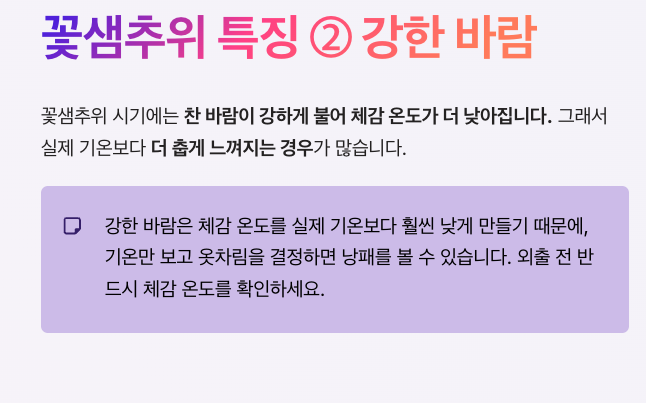 꽃샘추위 시기에는 찬 바람이 강하게 불어 체감 온도가 더 낮아집니다.