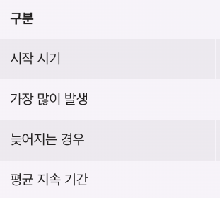 | 평균 지속 기간 | 3일 ~ 5일 |