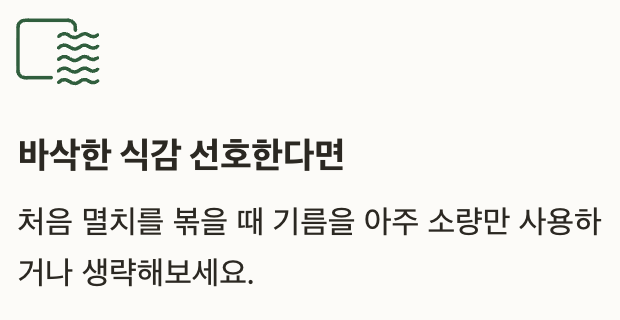 - 바삭한 식감 선호한다면 처음 멸치를 볶을 때 기름을 아주 소량만 사용하거나 생략해보세요.