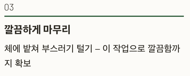 - 체에 밭쳐 부스러기 털기 – 이 작업으로 깔끔함까지 확보
