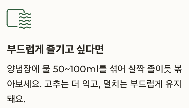 - 부드럽게 즐기고 싶다면 양념장에 물 50~100ml를 섞어 살짝 졸이듯 볶아보세요. 고추는 더 익고, 멸치는 부드럽게 유지돼요.