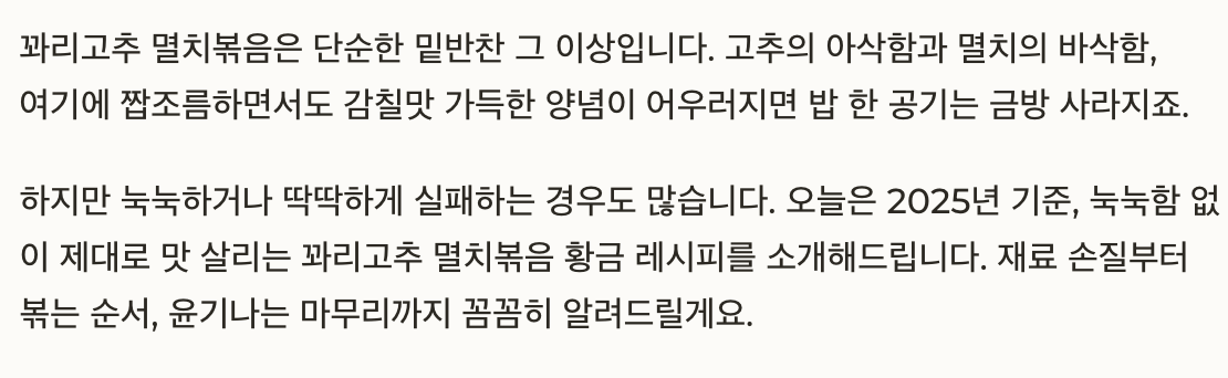 꽈리고추 멸치볶음은 단순한 밑반찬 그 이상이죠. 고추의 아삭함과 멸치의 바삭함, 여기에 짭조름하면서도 감칠맛 가득한 양념이 어우러지면 밥 한 공기는 금방 사라집니다. 하지만 눅눅하거나 딱딱하게 실패하는 경우도 많은데요. 오늘은 2025년 기준, 눅눅함 없이 제대로 맛 살리는 꽈리고추 멸치볶음 황금 레시피를 소개해드릴게요. 재료 손질부터 볶는 순서, 윤기 나는 마무리까지 꼼꼼히 알려드립니다.