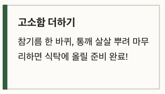 | 양념장 | 진간장, 맛술, 설탕, 물엿, 참기름, 통깨 | 진간장 3~4큰술 / 맛술 2큰술 / 설탕 1큰술 / 물엿 2큰술 / 참기름 1큰술 / 통깨 약간 |