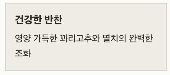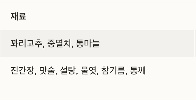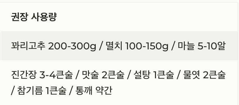 | 주재료 | 꽈리고추, 중멸치, 통마늘 | 꽈리고추 200~300g / 멸치 100~150g / 마늘 5~10알 |