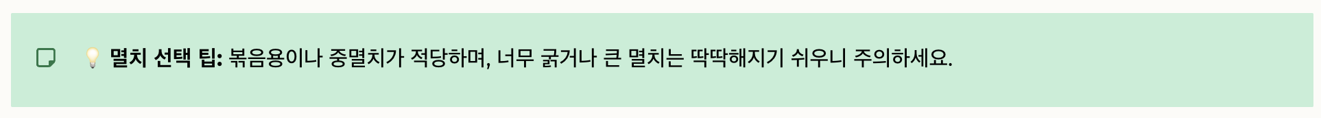 멸치는 볶음용이나 중멸치가 적당하며, 너무 굵거나 큰 멸치는 딱딱해지기 쉬우니 주의하세요.