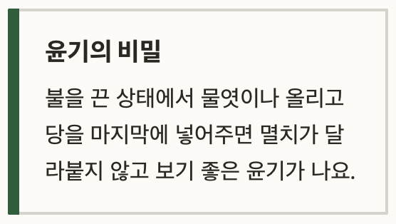 불을 끈 상태에서 물엿이나 올리고당을 마지막에 넣어주면 멸치가 달라붙지 않고 보기 좋은 윤기가 나요.
