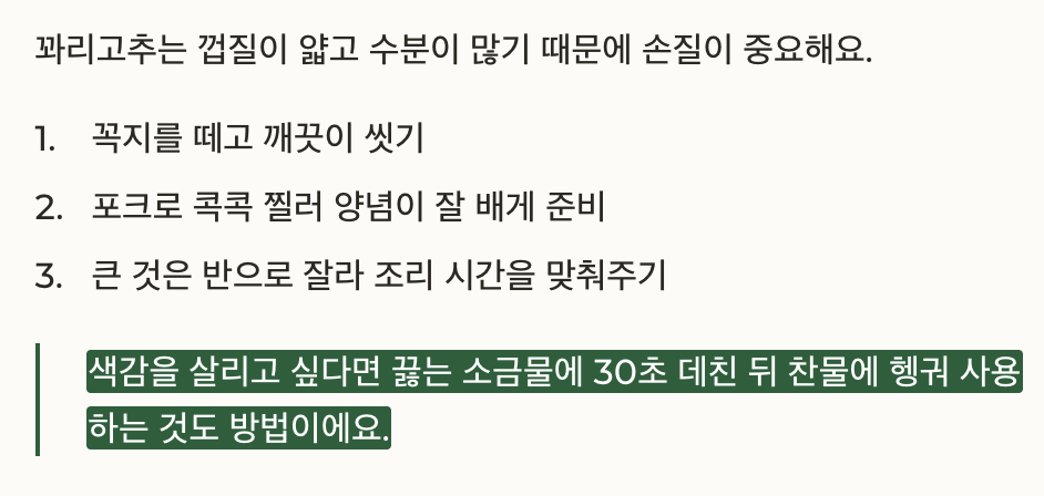 꽈리고추는 껍질이 얇고 수분이 많기 때문에 손질이 중요해요.