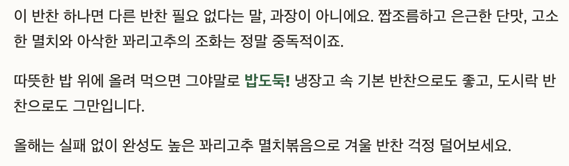 짭조름하고 은근한 단맛, 고소한 멸치와 아삭한 꽈리고추의 조화는 정말 중독적이죠.