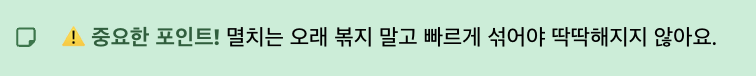 여기서 중요한 포인트! 멸치는 오래 볶지 말고 빠르게 섞어야 딱딱해지지 않아요.