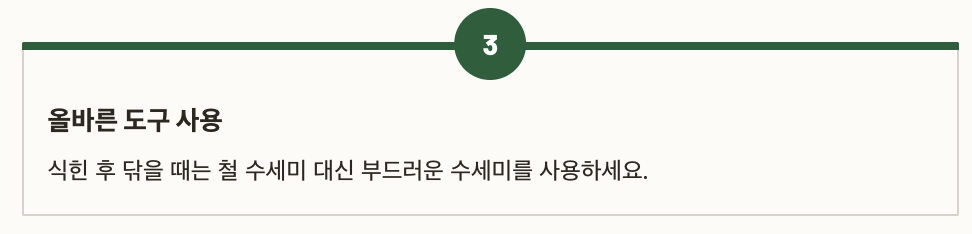 - 식힌 후 닦을 때는 철 수세미 대신 부드러운 수세미 사용