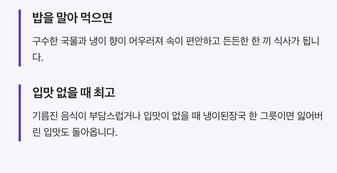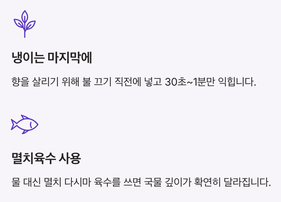 | 멸치육수 사용 | 깊은 국물 맛 |