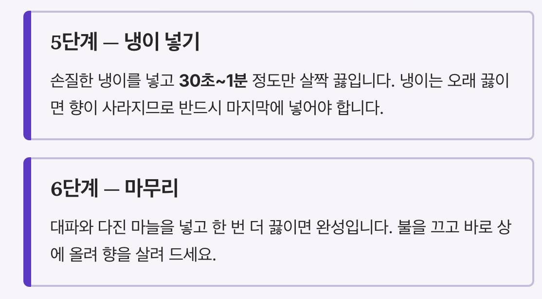 | 된장 | 1큰술 | 구수한 국물의 핵심 |