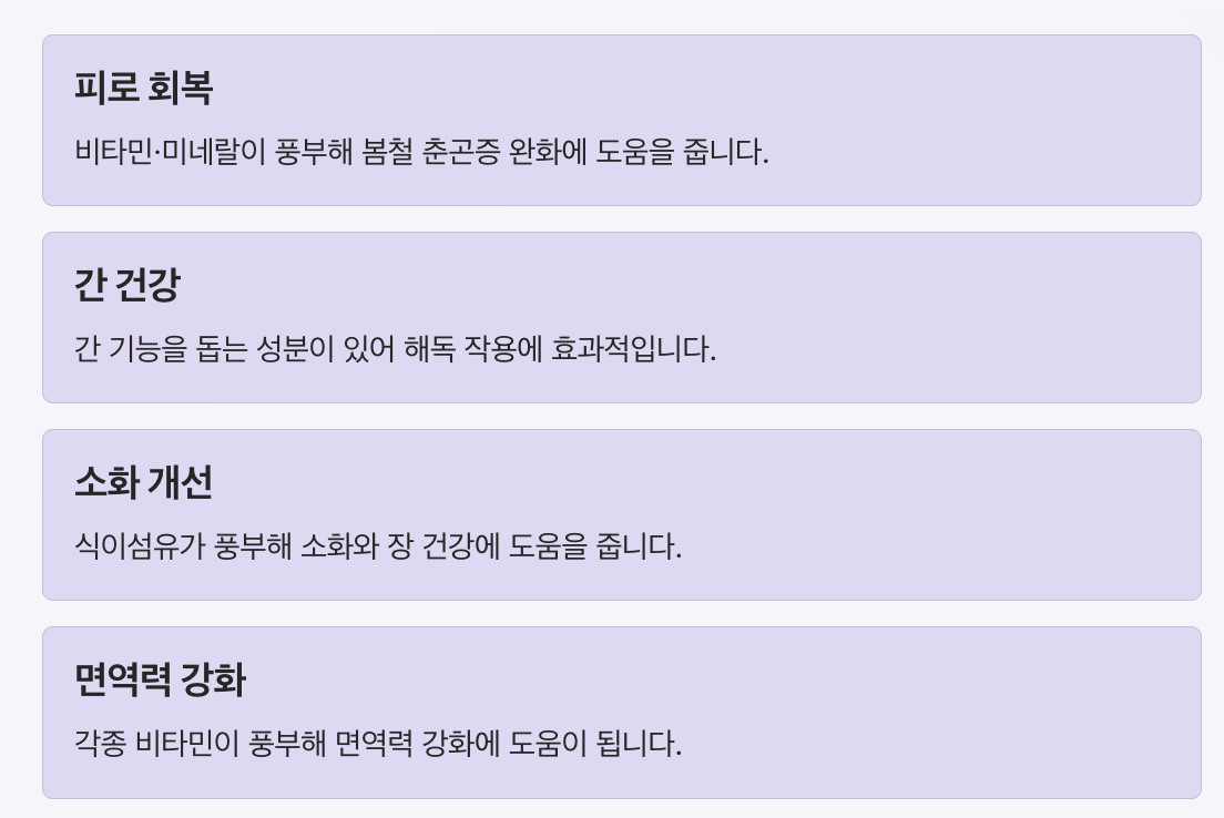 비타민과 미네랄이 풍부해 봄철 춘곤증 완화에 도움을 줍니다.