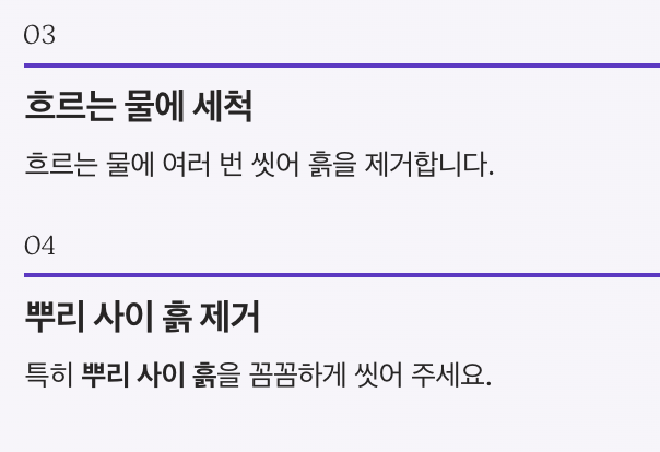 - 흐르는 물에 여러 번 씻어 흙을 제거합니다.