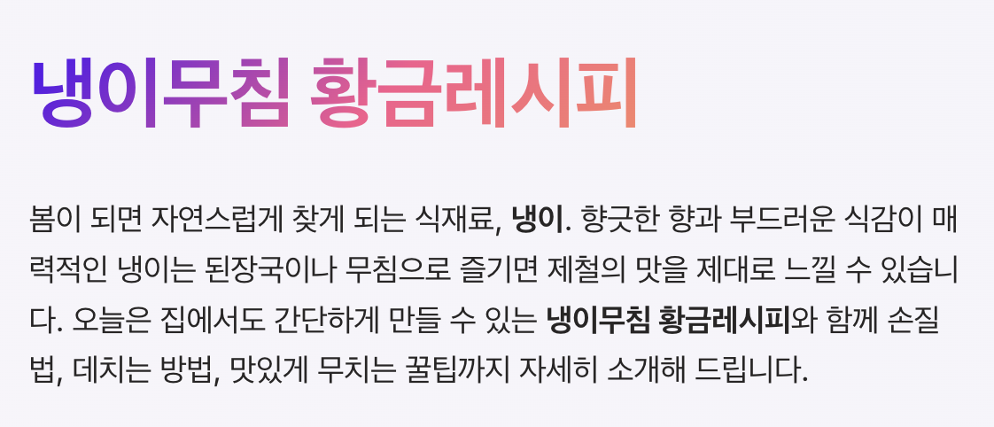 오늘은 봄철 대표 나물 반찬인 냉이무침 황금레시피를 소개해 드렸습니다. 냉이는 향긋한 봄의 맛을 그대로 느낄 수 있는 식재료라 간단하게 무쳐 먹기만 해도 밥상이 풍성해집니다.