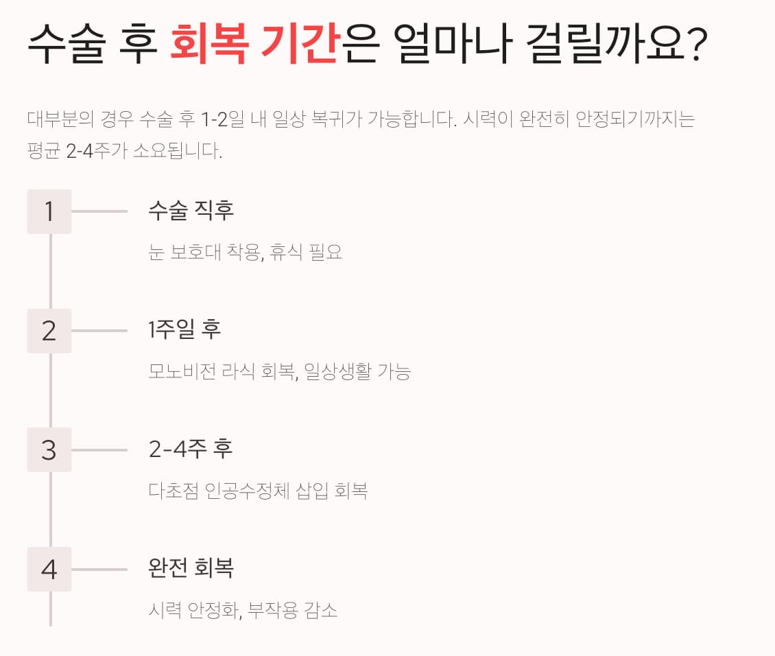 | 다초점 인공수정체 삽입 | 2~4주 | 빛 번짐 부작용 존재 가능 |