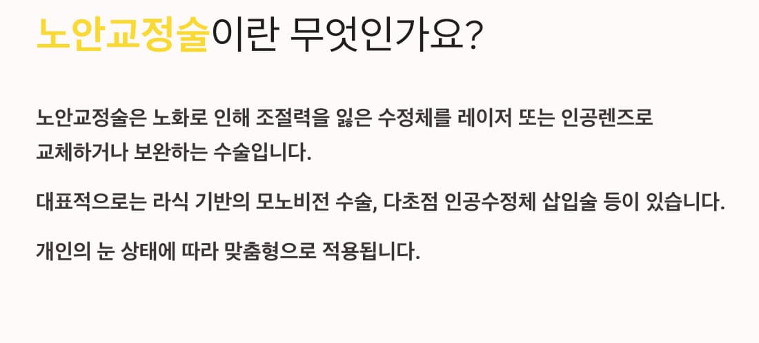 노안교정술은 노화로 인해 조절력을 잃은 수정체를