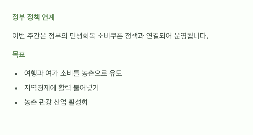 여행과 여가 소비를 농촌으로 유도하고, 지역경제에 활력을 불어넣는 것이 목표입니다.