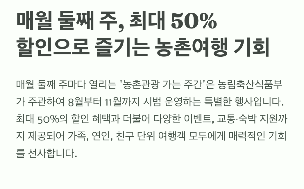 매월 둘째 주, 최대 50% 할인으로 즐기는 농촌여행 기회
