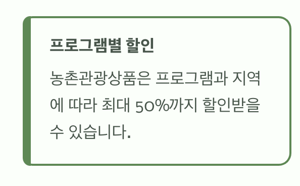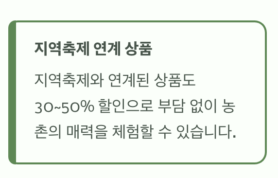 농촌관광상품은 프로그램과 지역에 따라 최대 50%까지 할인받을 수 있습니다.