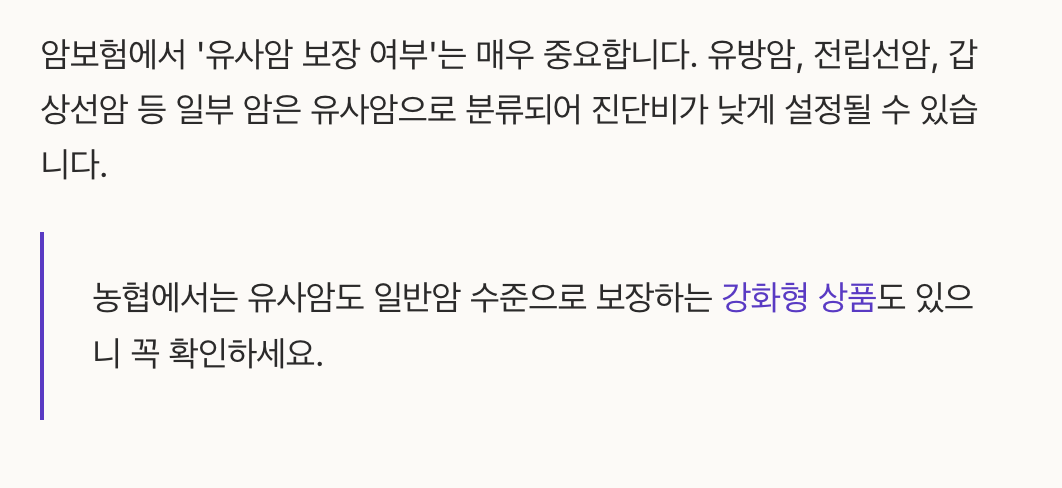 농협에서는 유사암도 일반암 수준으로 보장하는 강화형 상품도 있으니 꼭 확인해 보세요.