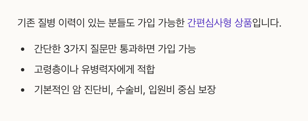 기존 질병 이력이 있는 분들도 가입 가능한 간편 심사형 상품입니다.