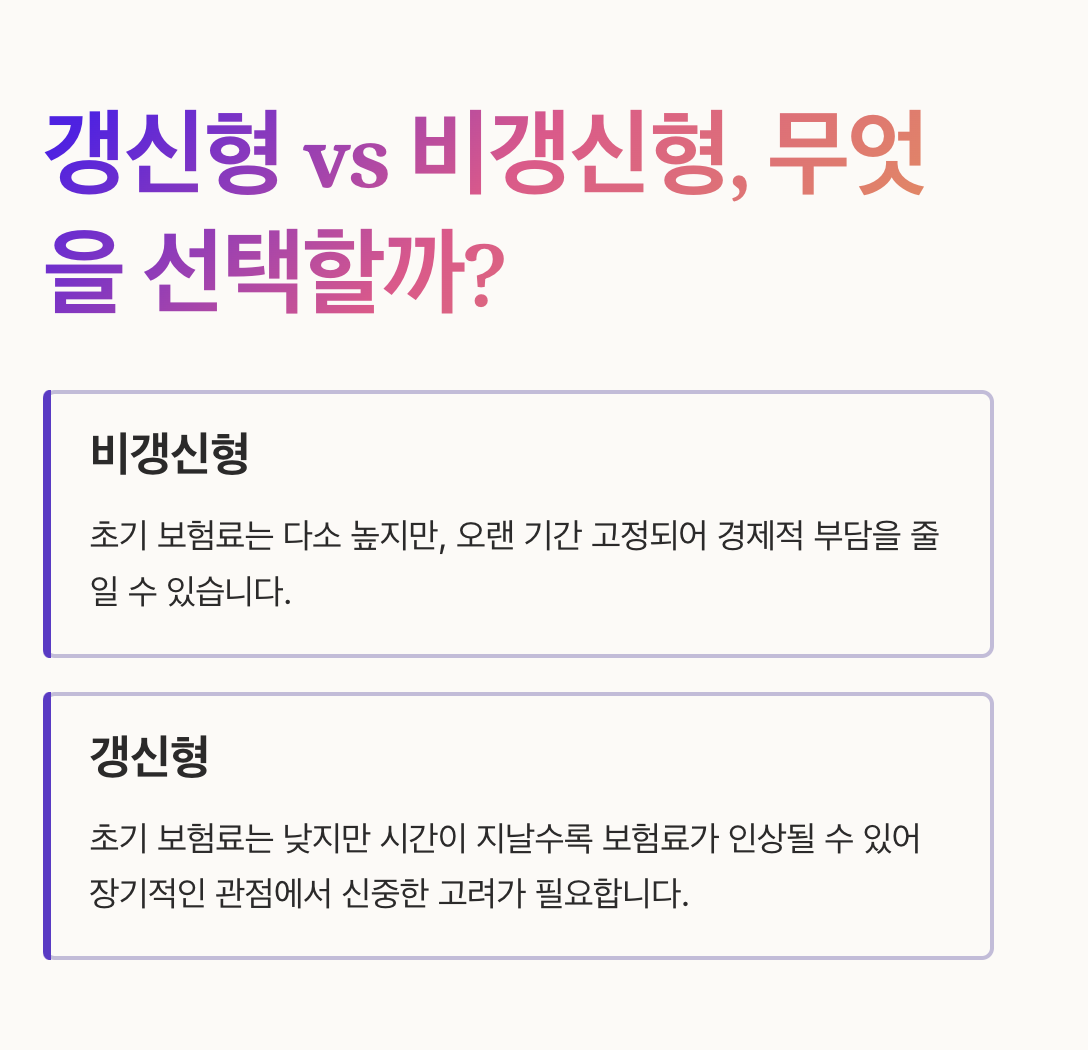 갱신형은 초기 보험료는 낮지만 시간이 지날수록 보험료가 인상될 수 있어 장기적인 관점에서 잘 따져봐야 합니다.