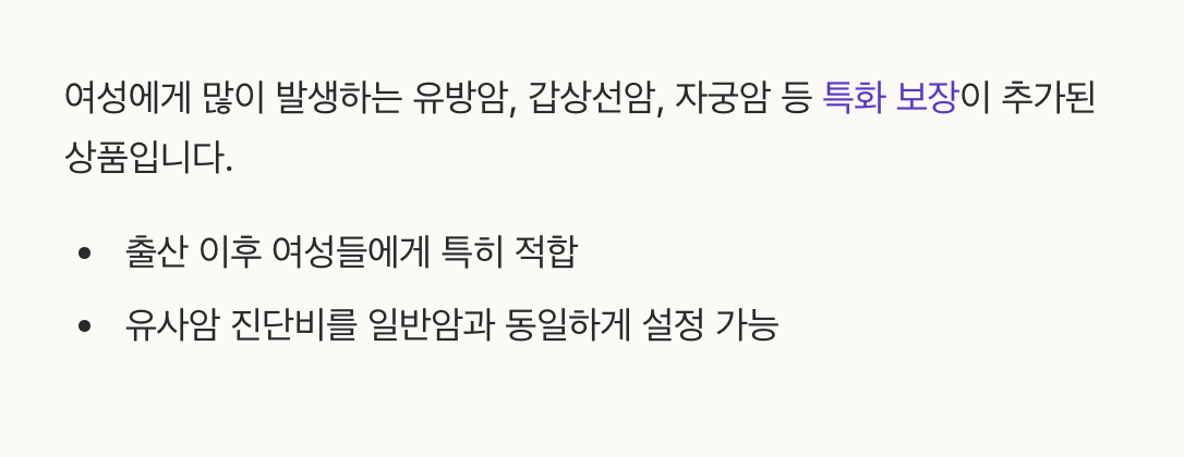 여성에게 많이 발생하는 유방암, 갑상선암, 자궁암 등 특화 보장이 추가된 상품입니다.