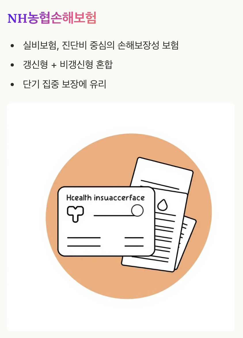 예를 들어 암 진단비, 수술비, 입원비를 중심으로 구성된 상품은 NH농협손해보험 상품에 많습니다.