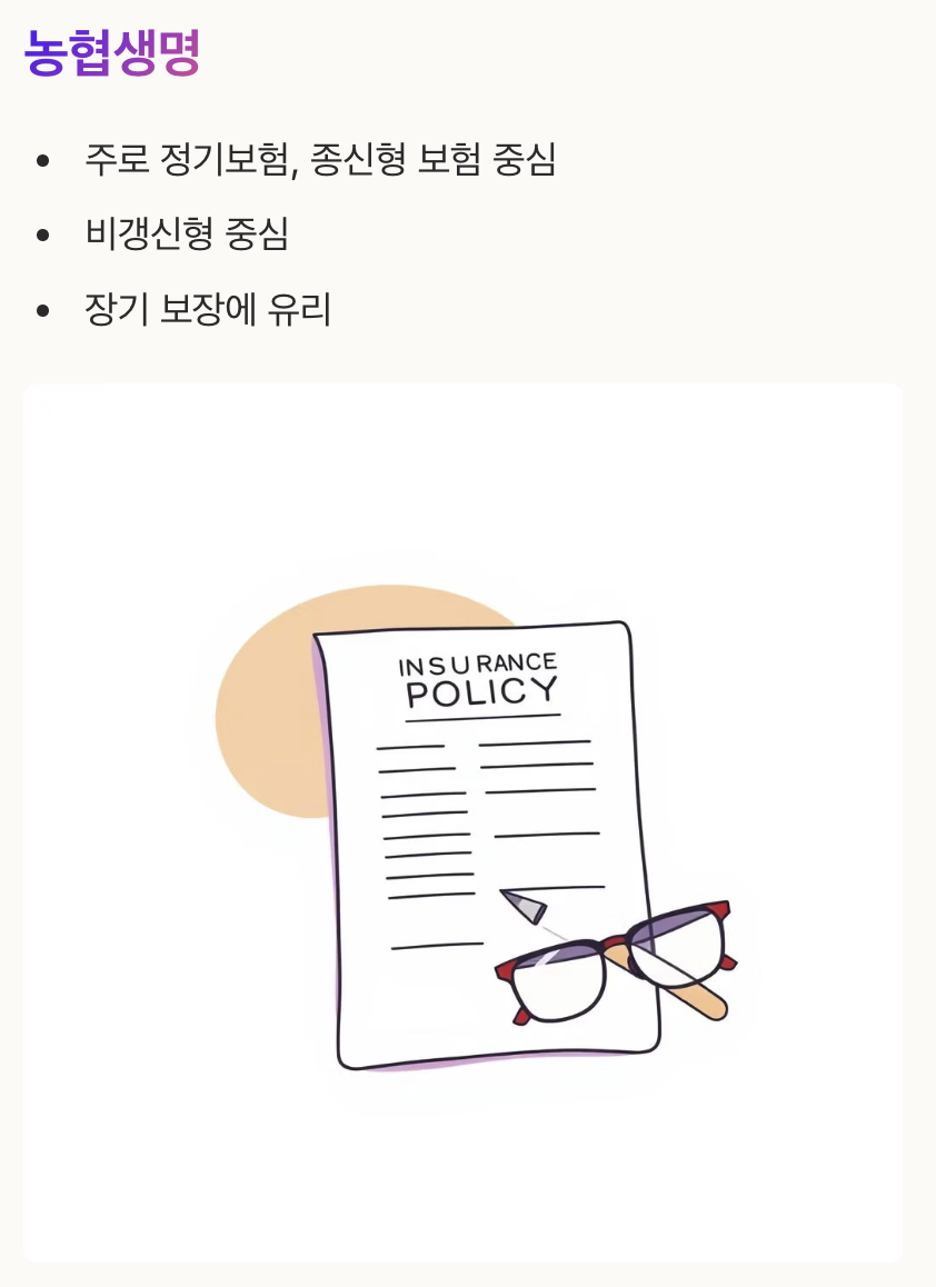 농협생명은 주로 정기보험이나 종신형 보험 중심이고, NH농협손해보험은 실비보험이나 진단비 중심의 손해보장성 보험을 제공합니다.