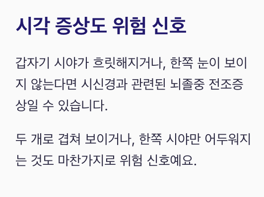 갑자기 시야가 흐릿해지거나, 한쪽 눈이 보이지 않는다면 시신경과 관련된 뇌졸중 전조증상일 수 있습니다.