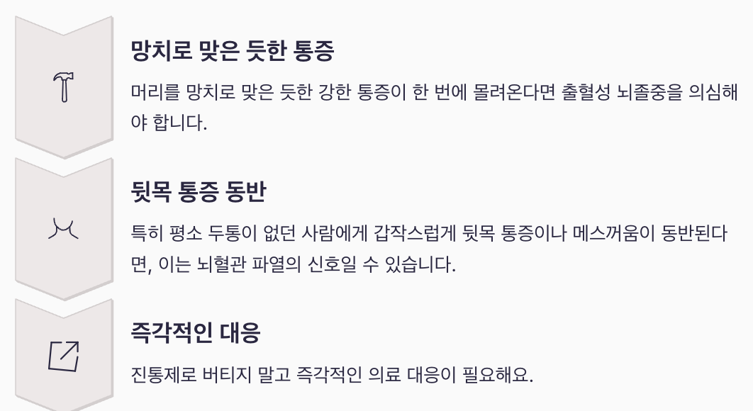 | 통증 증상 | 갑작스러운 극심한 두통, 뒷목 통증 |